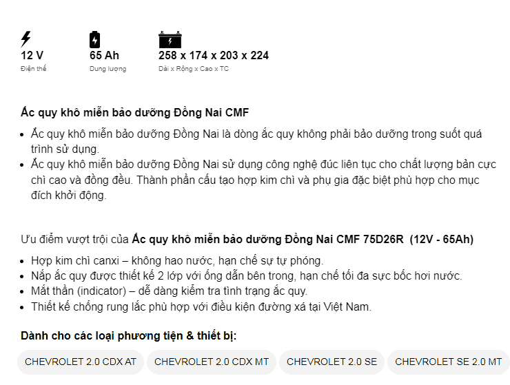 Dòng CMF là ắc quy miễn bảo dưỡng (ắc quy khô, kín) của Đồng Nai đảm bảo về chất lượng cũng như giá thành sản phẩm. Ắc quy làm từ hợp kim chì canxi có bổ sung thiếc, bạc nhập khẩu từ Úc nên không hao nước, hạn chế sự tự phóng điện. Nắp bình được thiết kế 2 lớp với ống dẫn bên trong, giúp giảm tối đa sự bốc hơi nước. Trong bình trang bị bộ phận lọc chống bắt lửa – an toàn khi sử dụng và Indicator (mắt thần) – dễ dàng kiểm tra tình trạng ắc quy.