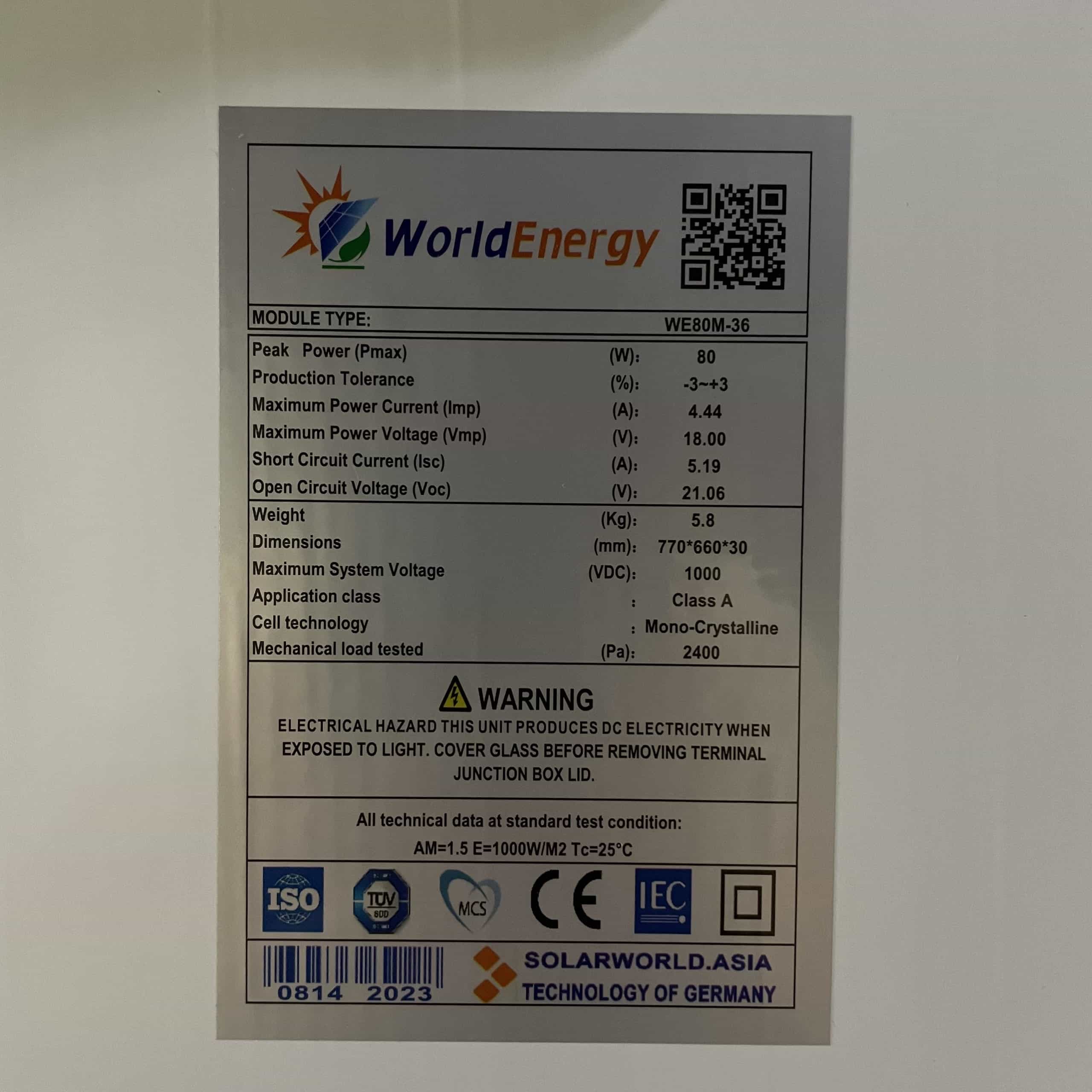 Thông số kỹ thuật TẤM PIN NĂNG LƯỢNG MẶT TRỜI MONO 80W WORLDENERGY