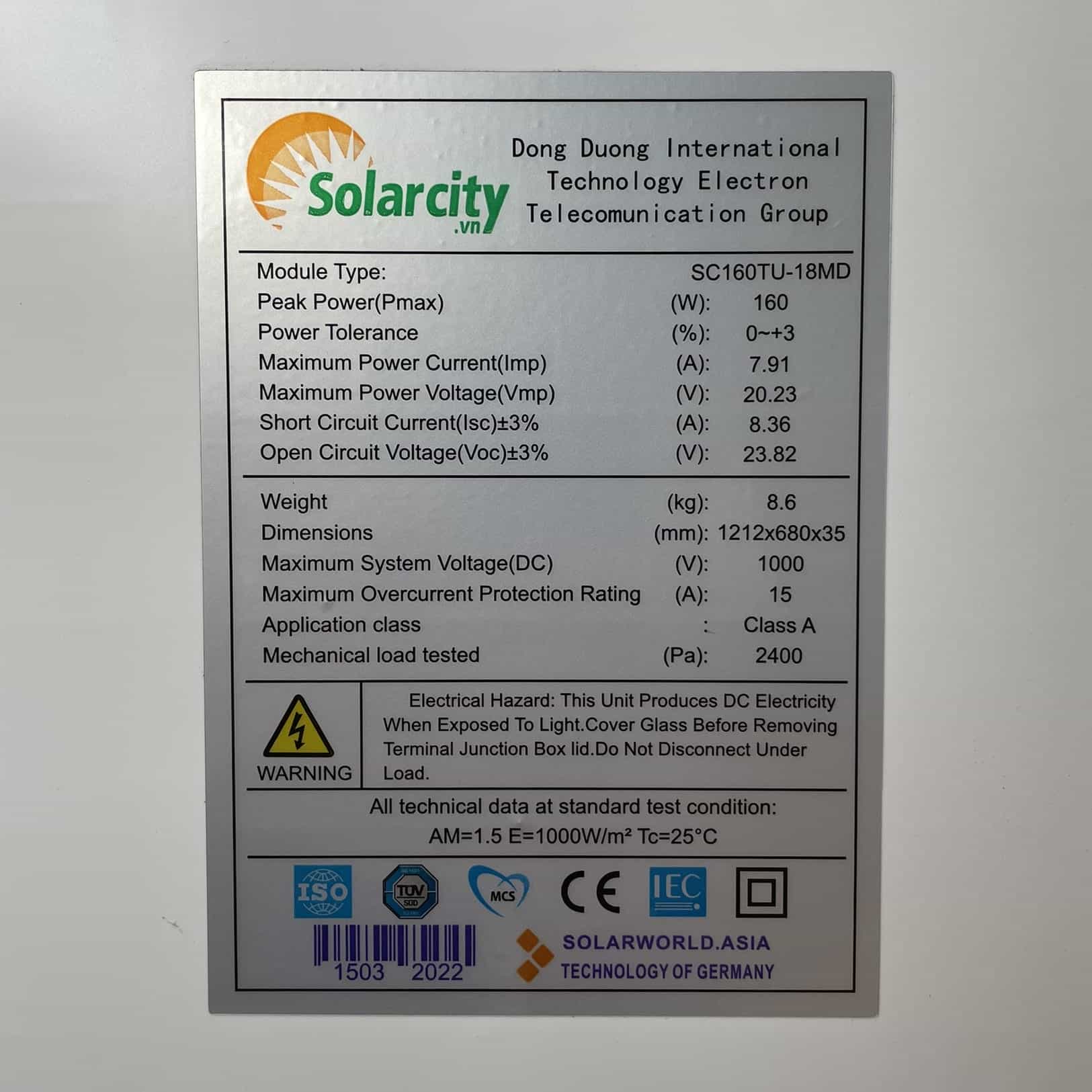 * Thông số kỹ thuật tấm PIN NĂNG LƯỢNG MẶT TRỜI MONO 160W